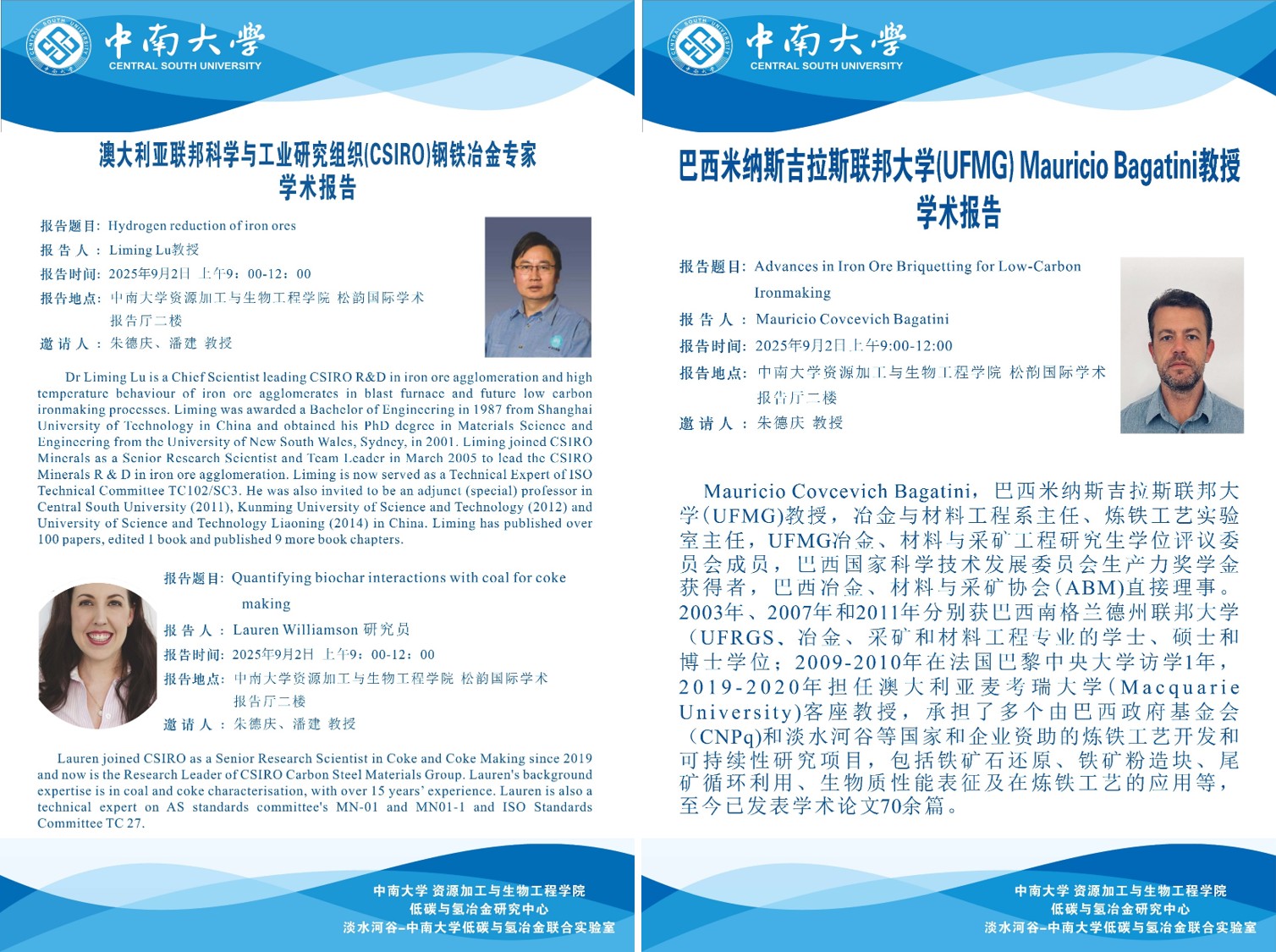 202592日,受朱德庆教授、潘建教授邀请,澳大利亚联邦科学与工业研究组织矿物资源所(CSIRO Mineral Resources)高级首席科学家Liming Lu教授和碳钢材料组(Carbon Steel Materials Group)科研主管Lauren Williamson研究员、巴西米纳斯吉拉斯联邦大学(UFMG)冶金工程系主任Mauricio Bagatini教授三位冶金专家来我院访问交流,并分别作了题为《Hydrogen reduction of iron ores》、《Quantifying biochar interactions with coal for coke making》和《Advances in Iron Ore Briquetting for Low-Carbon ironmaking》的精彩学术讲座。现场钢铁系师生就学术讲座和当前低碳与氢冶金技术发展等相关问题与专家们进行了深入沟通,现场互动气氛热烈。讲座由朱德庆教授、潘建教授共同主持。
