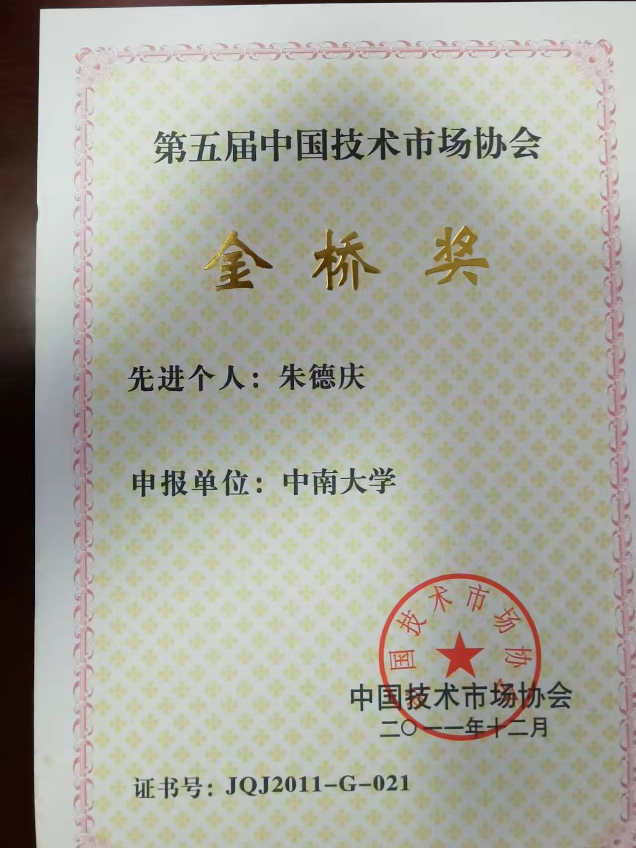 2011年12月朱德庆教授获第五届中国技术市场协会金桥奖