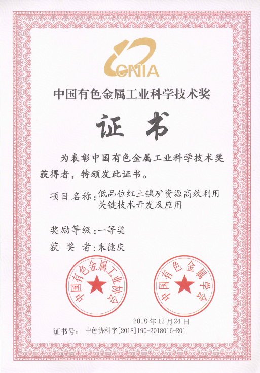2018年12月:中国有色金属工业科学技术奖一等奖--低品位红土镍矿资源高效利用关键技术开发及应用